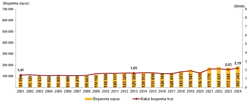 Boşanan çiftlerin sayısı 2023 yılında 173 bin 342 iken 2024 yılında 187 bin 343 oldu. Bin nüfus başına düşen boşanma sayısını ifade eden kaba boşanma hızı 2024 yılında binde 2,19 olarak gerçekleşti.