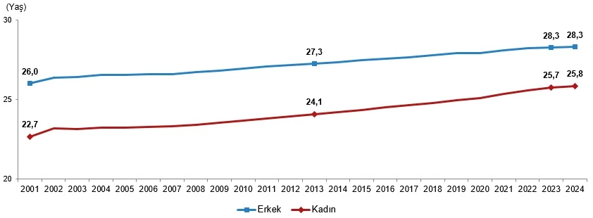 Yıllara göre ortalama ilk evlenme yaşı incelendiğinde, her iki cinsiyette de ilk evlenme yaşının arttığı görüldü. Ortalama ilk evlenme yaşı 2024 yılında erkeklerde 28,3 iken kadınlarda 25,8 oldu. Erkek ile kadın arasındaki ortalama ilk evlenme yaş farkı ise 2,5 yaş olarak gerçekleşti.