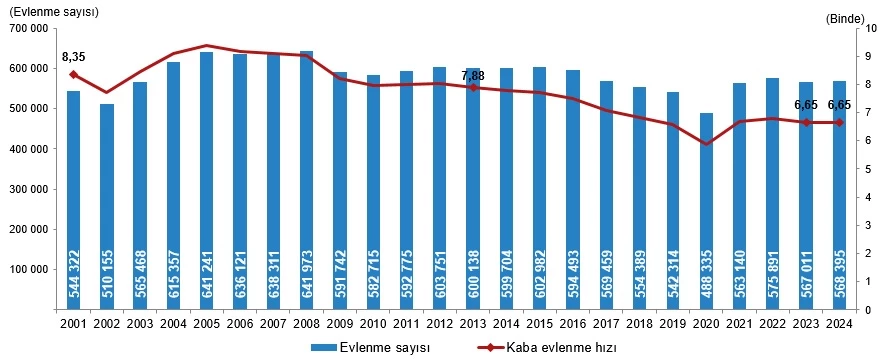 Evlenen çiftlerin sayısı 2023 yılında 567 bin 11 iken 2024 yılında 568 bin 395 oldu. Bin nüfus başına düşen evlenme sayısını ifade eden kaba evlenme hızı 2024 yılında binde 6,65 olarak gerçekleşti.