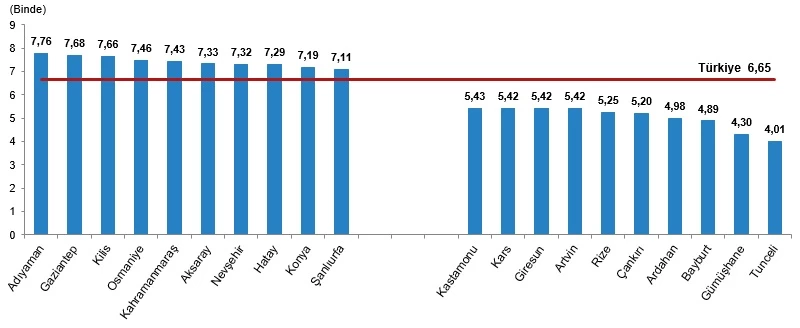 Kaba evlenme hızının 2024 yılında en yüksek olduğu il, binde 7,76 ile Adıyaman oldu. Bu ili binde 7,68 ile Gaziantep, binde 7,66 ile Kilis izledi. Kaba evlenme hızının en düşük olduğu il ise binde 4,01 ile Tunceli oldu. Bu ili binde 4,30 ile Gümüşhane, binde 4,89 ile Bayburt izledi.