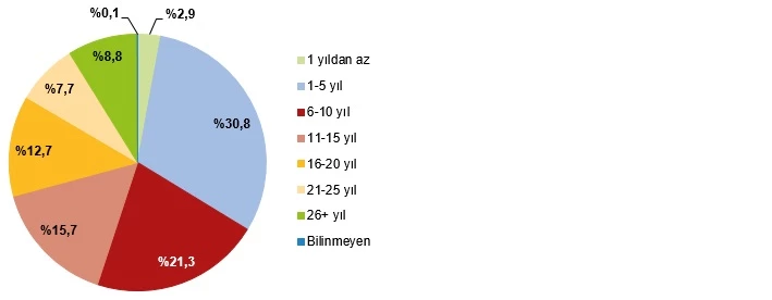 Evlilik süresine göre boşanmalar incelendiğinde, 2024 yılında gerçekleşen boşanmaların %33,7'si evliliğin ilk 5 yılı, %21,3'ü ise evliliğin 6-10 yılı içinde gerçekleşti.