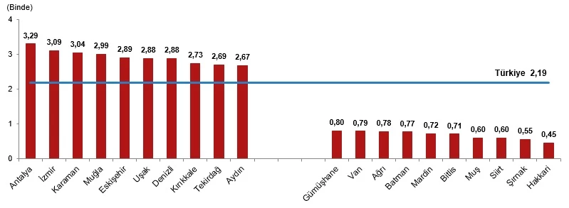 Kaba boşanma hızının 2024 yılında en yüksek olduğu il, binde 3,29 ile Antalya oldu. Bu ili binde 3,09 ile İzmir, binde 3,04 ile Karaman izledi. Kaba boşanma hızının en düşük olduğu il ise binde 0,45 ile Hakkari oldu. Bu ili binde 0,55 ile Şırnak, binde 0,60 ile Siirt ve Muş izledi.