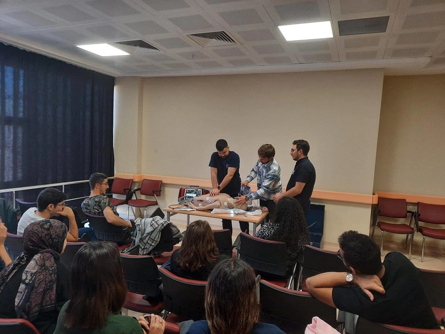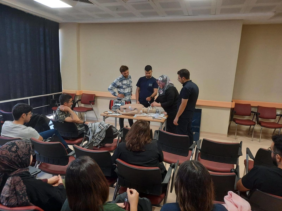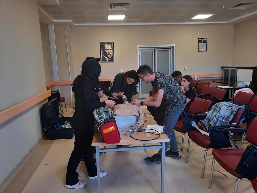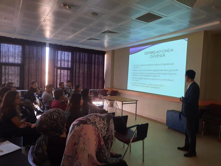 Eğitim programında kardiyopulmoner resüsitasyonun (CPR) güncel uygulamaları, kırmızı alanda hasta yönetimi, ekip içi koordinasyon ve vaka senaryoları ele alındı.