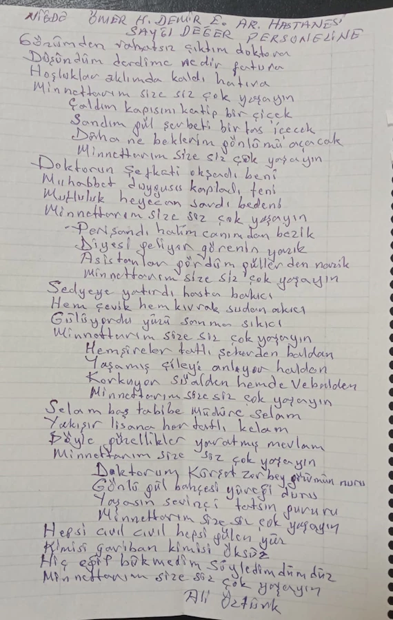 Öztürk’ün sağlık personellerine ithafen yazdığı şiir, hastane yönetimi tarafından büyük takdirle karşılandı. Niğde Ömer Halisdemir Üniversitesi Eğitim ve Araştırma Hastanesi Başhekimi Dr. Öğr. Üyesi Mustafa Doğan, anlamlı şiiri teslim alarak emekli imama teşekkür etti.