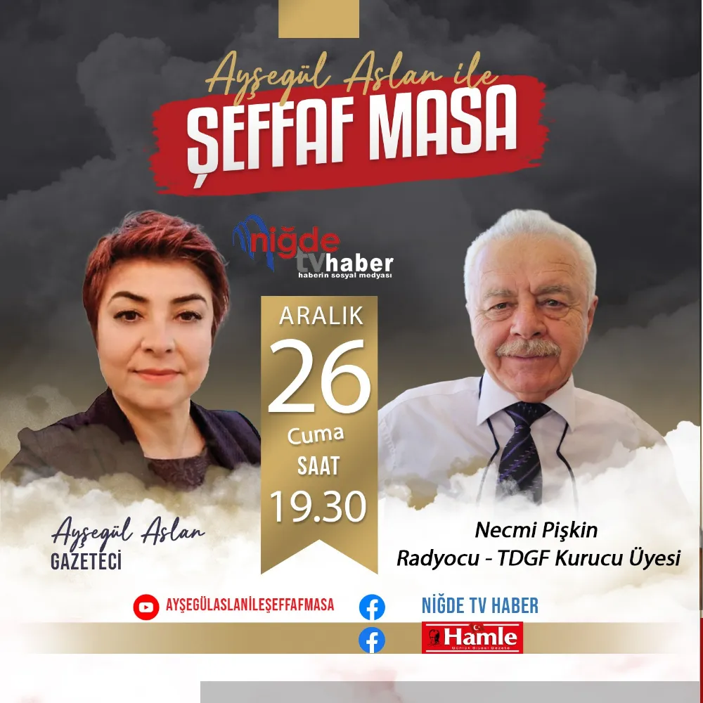 Ayşegül Aslan ile Şeffaf Masa ”, 26 Aralık Cuma günü saat 19.00’da Niğde TV, Hamle Gazetesi Facebook sayfası ve Ayşegül Aslan ile Şeffaf Masa YouTube kanalı üzerinden izleyicilerle buluşacak.