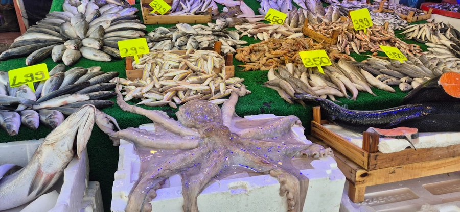 Kaya kefalı 150 TL, küpez 100 TL, sardalya 150 TL, istavrit 150 TL, azman istavrit 200 TL, hamsi 200 TL, uskumru 200 TL, çupra 650 TL, levrek 700 TL, büyük boy levrek 800 TL. Deniz ürünleri arasında ahtapot ve dil balığının kilogram fiyatı 2 bin TL olurken, Norveç somonu ise kilosu 1 bin 500 TL’den alıcı buluyor.