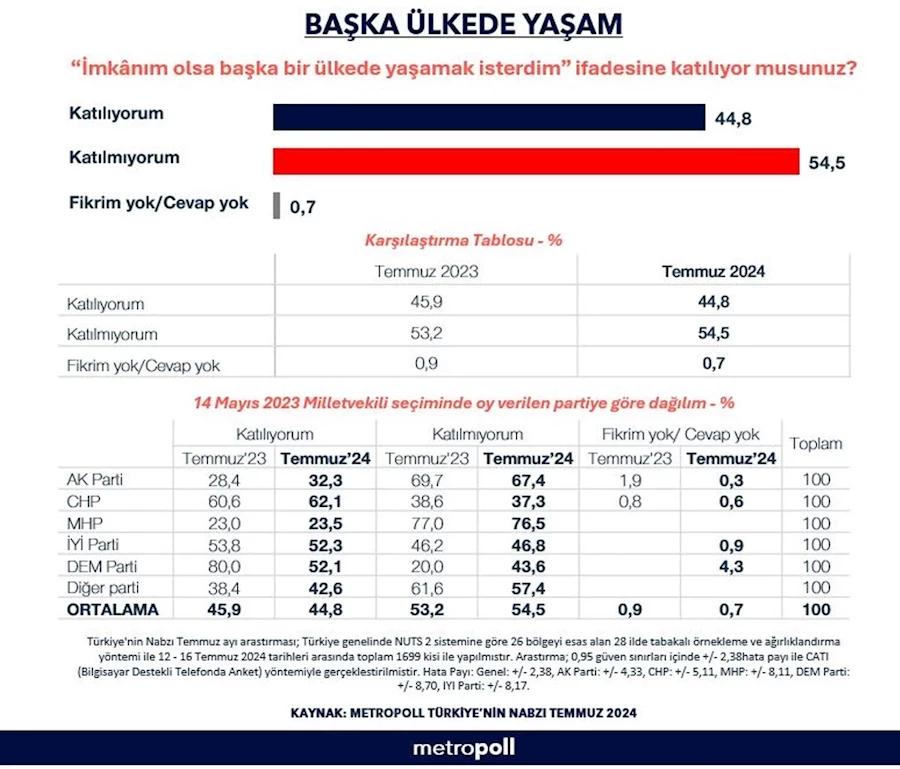 Araştırmada ‘İmkanınız olsa başka ülkede yaşamak ister misiniz’ sorusuna katılımcıların yüzde 44,8’i ‘Evet’, yüzde 54,5’i ‘Hayır’ yanıtı verdi.