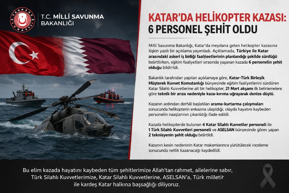 Bakanlık tarafından yapılan açıklamaya göre, Katar-Türk Birleşik Müşterek Kuvvet Komutanlığı bünyesinde eğitim faaliyetlerini sürdüren Katar Silahlı Kuvvetlerine ait bir helikopter, 21 Mart akşamı ilk belirlemelere göre teknik bir arıza nedeniyle kaza-kırıma uğrayarak denize düştü.