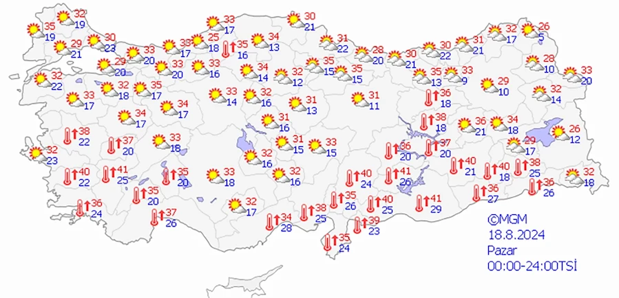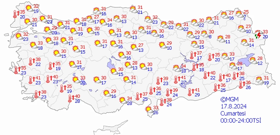 “Ankara 29-37, İstanbul 31-33, İzmir 33-36, Konya 28-36, Antalya 33-39, Adana 35-37, Kocaeli 32-35, Bolu 30-33, Samsun 30-32, Trabzon 28-30, Tokat 30-40, Erzurum 28-33, Diyarbakır 38-42, Hatay 33-36.”