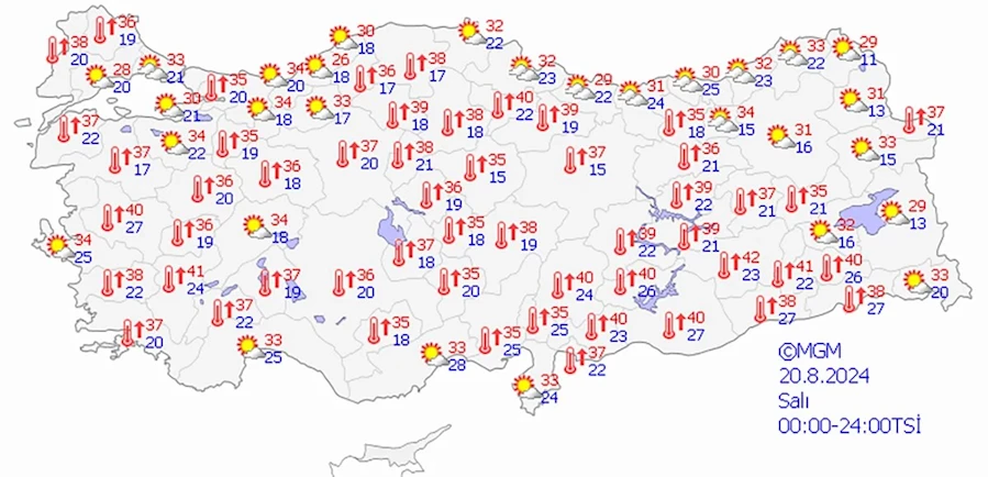 Meteoroloji Genel Müdürlüğü'nden yapılan açıklamaya göre, pazartesi gününden itibaren bazı iç kesimlerde sıcaklıklar mevsim normallerinin 4-8 derece üzerine çıkacak. Özellikle Doğu Anadolu Bölgesi'nde yer yer 40 dereceleri bulacak sıcaklıklar bekleniyor. Kıyı kesimlerde ise sıcaklıklar mevsim normallerinin 1 ila 3 derece üzerinde seyredecek.