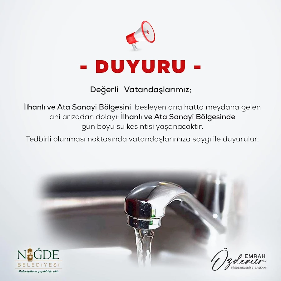 Niğde Belediyesi'nden konu hakkında yapılan duyuruda, "Değerli vatandaşlarımız, İhanlı ve Ata Sanayi Bölgesini besleyen ana hatta meydana gelen ani arızadan dolayı İlhanlı ve Ata Sanayi Bölgesinde gün boyu su kesintisi yaşanacaktır. Tedbirli olunması noktasında vatandaşlarımıza saygı ile duyurulur" denildi.