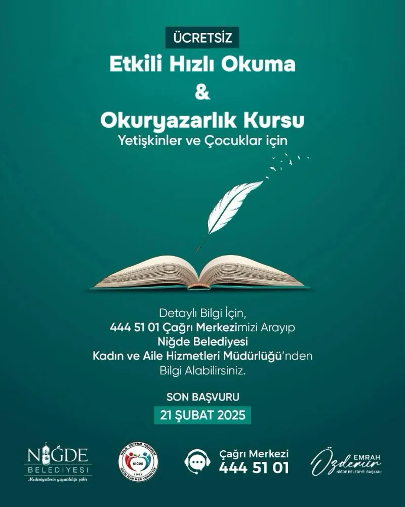Niğde Belediyesi, yetişkinler ve çocuklar için ücretsiz “Etkili Hızlı Okuma & Okuryazarlık Kursu” düzenliyor. Kursa başvurular 21 Şubat 2025 tarihine kadar devam edecek.