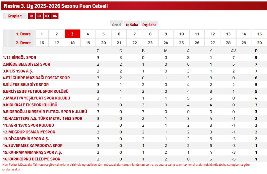 Bu sonuçla iki ekip de puanını 7’ye yükseltirken, Niğde Belediyespor averajla 2. sıradaki yerini korudu, Kilis 1984 A.Ş. ise 3. sırada kaldı.
