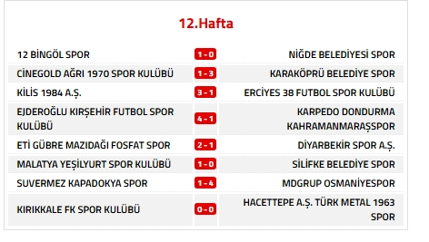 Bu sonucun ardından 12 Bingölspor puanını 31’e yükselterek zirvedeki yerini sağlamlaştırdı. Niğde Belediyespor ise 12 haftada 5 galibiyet, 4 beraberlik ve 3 mağlubiyet alarak 19 puanla ikinci sıradaki yerini korudu ve lider takibini sürdürdü.