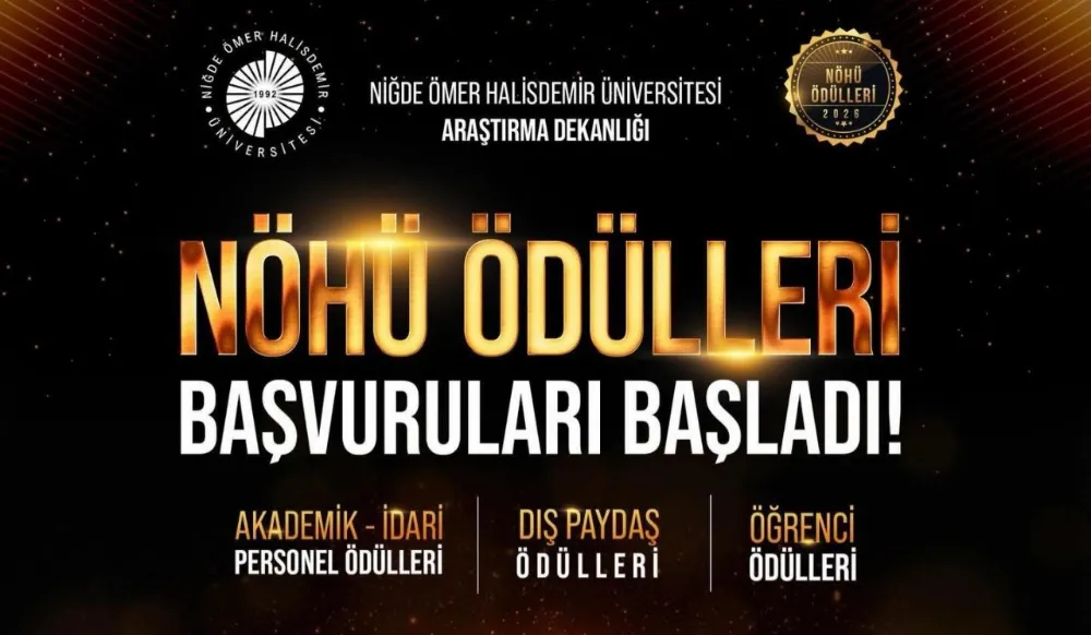 Niğde Ömer Halisdemir Üniversitesi tarafından yapılan duyuruda, akademik ve idari personel, öğrenciler ile üniversiteye katkı sunan dış paydaşların 2026 NÖHÜ Ödülleri için başvuru yapabileceği bildirildi. Üniversite Araştırma Dekanlığı koordinasyonunda yürütülen ödül programı kapsamında; akademik personel ödülleri, idari personel ödülleri, öğrenci ödülleri ve dış paydaş ödülleri kategorilerinde değerlendirme yapılacak.