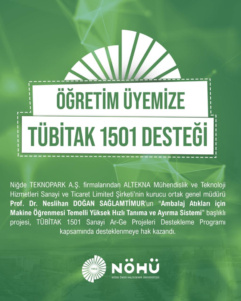 Niğde TEKNOPARK A.Ş. bünyesinde faaliyet gösteren ALTEKNA Mühendislik ve Teknoloji Hizmetleri Sanayi ve Ticaret Limited Şirketi’nin “Ambalaj Atıkları için Makine Öğrenmesi Temelli Yüksek Hızlı Tanıma ve Ayırma Sistemi” başlıklı projesi, TÜBİTAK 1501 Sanayi Ar-Ge Projeleri Destekleme Programı kapsamında desteklenmeye hak kazandı. Proje ile ambalaj atıklarının yapay zekâ destekli sistemlerle otonom olarak tanınması ve ayrıştırılması hedefleniyor.