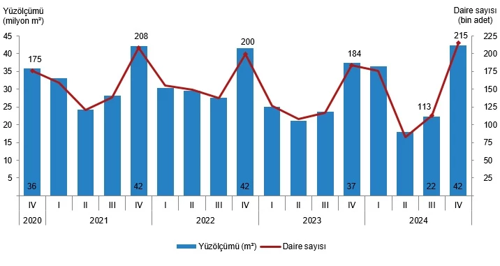 Belediyeler tarafından 2024 yılı IV. çeyreğinde yapı kullanma izin belgesi verilen binaların toplam yüzölçümü 42,4 milyon m² iken; bunun 23,5 milyon m²'si konut, 9,6 milyon m²'si konut dışı ve 9,2 milyon m²'si ise ortak kullanım alanı olarak gerçekleşti.