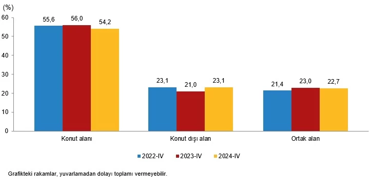 Yapı kullanma izin belgesine göre konut, konut dışı ve ortak alanların yüzölçümü payları, IV. Çeyrek, 2022-2024