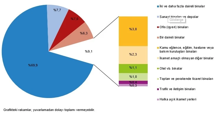 En yüksek yüzölçüm payı %69,9 ile iki ve daha fazla daireli binaların oldu