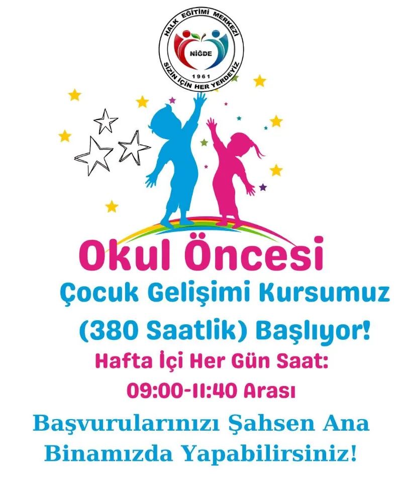 Niğde Halk Eğitimi Merkezi, okul öncesi dönemde çocuk gelişimi ve eğitimi alanında kendini geliştirmek isteyenler için 380 saatlik “Okul Öncesi Çocuk Gelişimi ve Eğitimi” kursu açıyor.