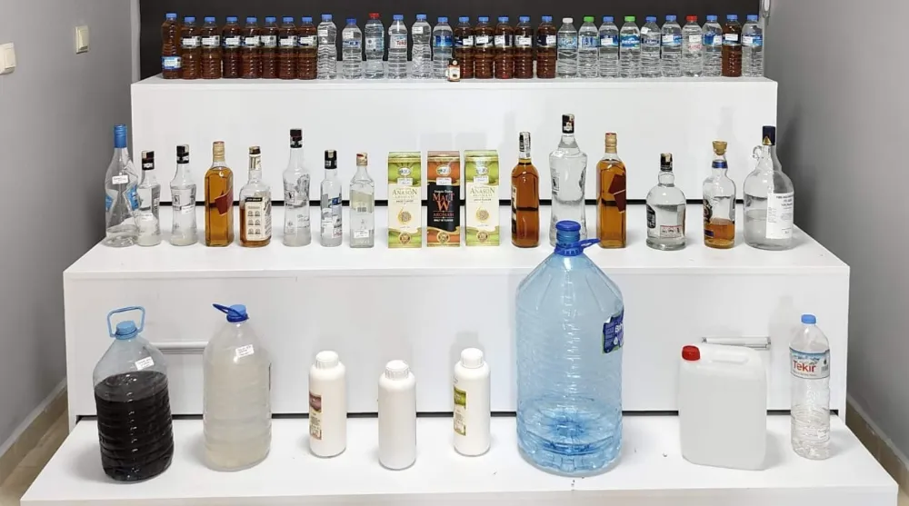 Şüphelilerin ev, iş yeri ve araçlarında yapılan aramalarda 71 şişe el yapımı sahte içki, 20 litre etil alkol ve 6 adet anason ele geçirildi.