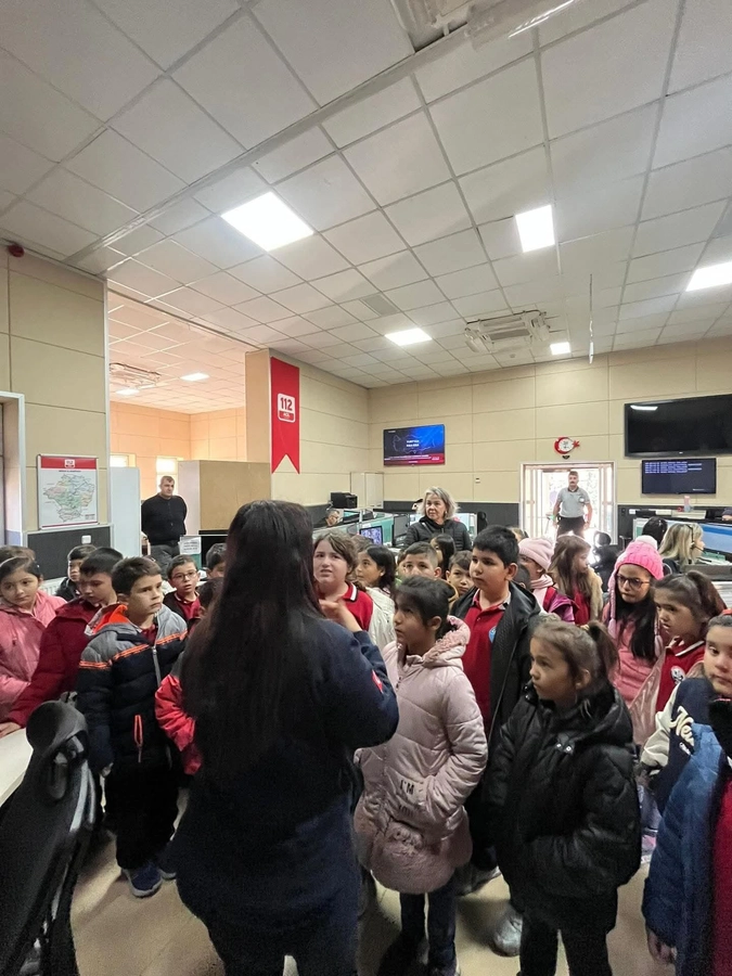 Düzenlenen etkinlikte minik öğrencilere 112 Acil Çağrı Merkezi’nin nasıl çalıştığı anlatıldı ve acil durumlarda doğru şekilde yardım istemenin önemi vurgulandı.
