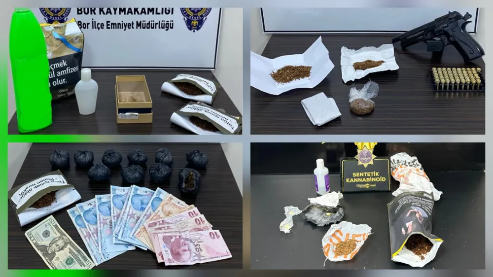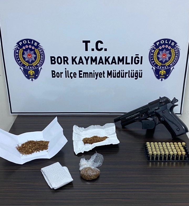 Niğde ve Bor Cumhuriyet Başsavcılığı koordinesinde Narkotik Suçlarla Mücadele Şube Müdürlüğü ve Bor İlçe Emniyet Müdürlüğü ekiplerince gerçekleştirilen çalışmalarda çok sayıda uyuşturucu madde ve suç unsuru ele geçirildi.