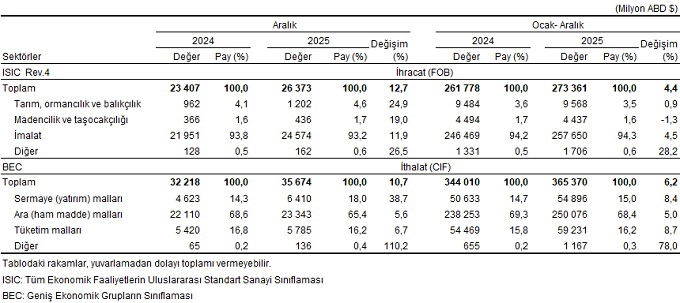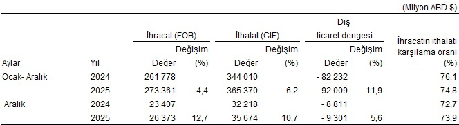 Türkiye İstatistik Kurumu ile Ticaret Bakanlığı iş birliğiyle genel ticaret sistemi kapsamında üretilen geçici dış ticaret verilerine göre; ihracat 2025 yılı Aralık ayında, bir önceki yılın aynı ayına göre %12,7 artarak 26 milyar 373 milyon dolar, ithalat %10,7 artarak 35 milyar 674 milyon dolar olarak gerçekleşti.