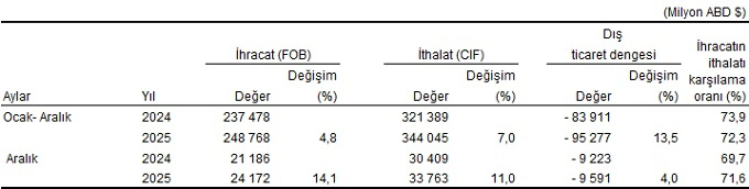 Aralık ayında dış ticaret açığı bir önceki yılın aynı ayına göre %5,6 artarak 8 milyar 811 milyon dolardan, 9 milyar 301 milyon dolara yükseldi. İhracatın ithalatı karşılama oranı 2024 Aralık ayında %72,7 iken, 2025 Aralık ayında %73,9'a yükseldi.