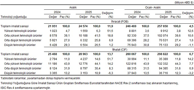 Teknoloji yoğunluğuna göre imalat sanayi ürünleri dış ticareti, Aralık 2025