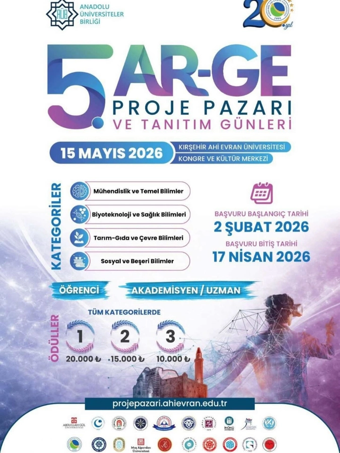 15 Mayıs 2026 tarihinde Kırşehir Ahi Evran Üniversitesi Kongre ve Kültür Merkezi’nde gerçekleştirilecek etkinlikte öğrenciler, akademisyenler ve uzmanlar projelerini tanıtma ve yatırımcılarla buluşturma imkânı elde edecek.
