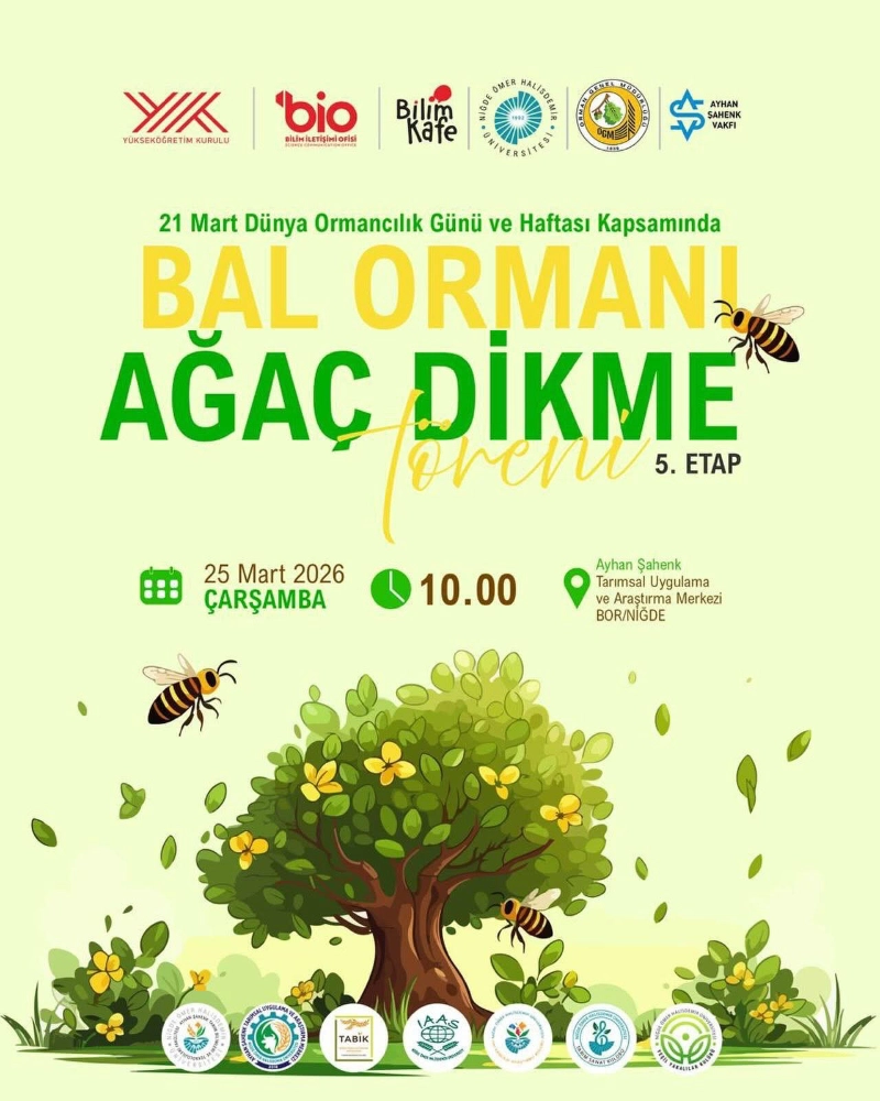 Bal Ormanı Ağaç Dikme Töreni, 25 Mart 2026 Çarşamba günü saat 10.00’da Bor ilçesinde bulunan Ayhan Şahenk Tarımsal Uygulama ve Araştırma Merkezi’nde gerçekleştirilecek.