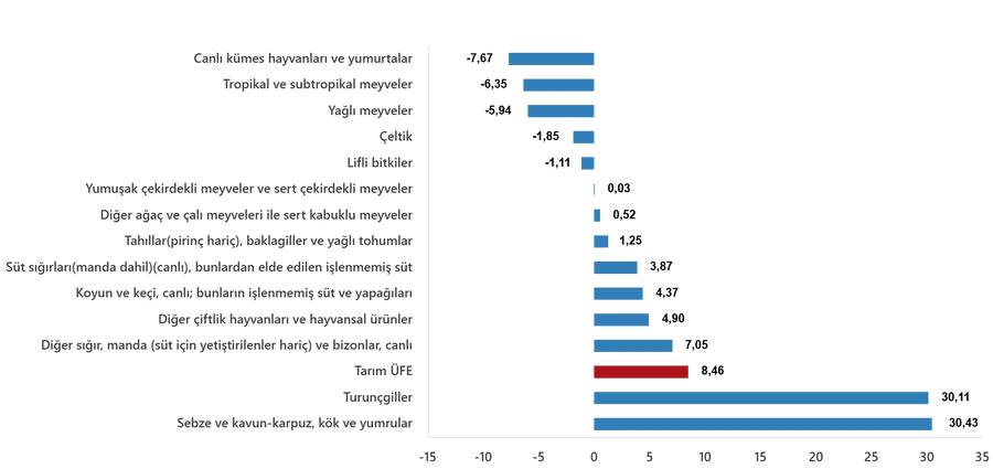 Sektörlerde bir önceki aya göre, tarım ve avcılık ürünleri ve ilgili hizmetlerde %8,42 artış, ormancılık ürünleri ve ilgili hizmetlerde %14,36 artış ve balık ve diğer balıkçılık ürünleri; su ürünleri; balıkçılık için destekleyici hizmetlerde %4,08 artış gerçekleşti. Ana gruplarda bir önceki aya göre, tek yıllık (uzun ömürlü olmayan) bitkisel ürünlerde %12,14 artış, çok yıllık (uzun ömürlü) bitkisel ürünlerde %7,00 artış ve canlı hayvanlar ve hayvansal ürünlerde %4,02 artış gerçekleşti.