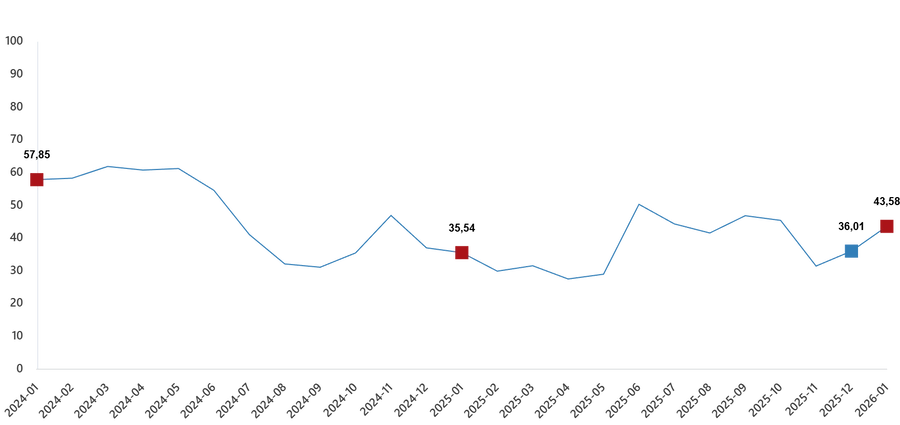 Tarım-ÜFE'de (2020=100), 2026 yılı Ocak ayında bir önceki aya göre %8,46 artış, bir önceki yılın Aralık ayına göre %8,46 artış, bir önceki yılın aynı ayına göre %43,58 artış ve on iki aylık ortalamalara göre %38,18 artış gerçekleşti.
