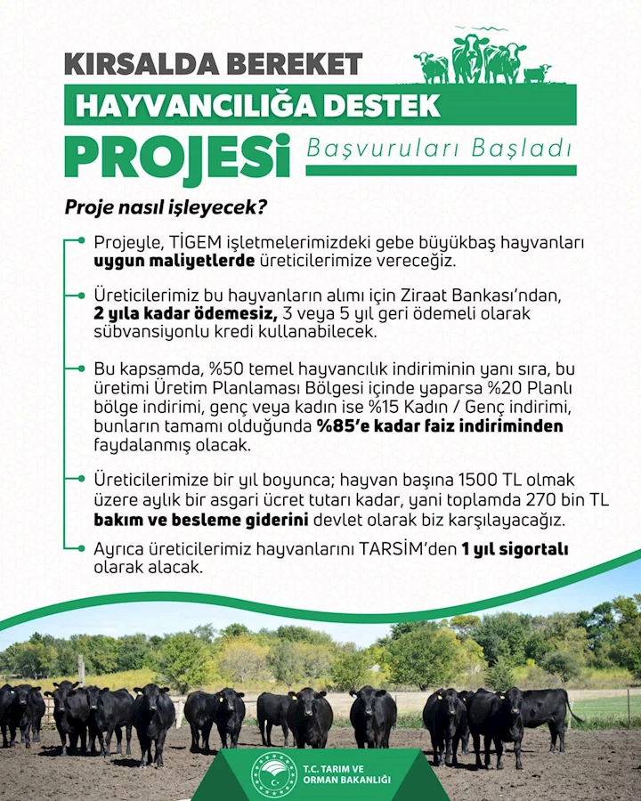 Yapılan açıklamada Hayvancılığa Destek Projesinin detayları hakkında bilgi verilirken destekten yararlanma şartlarının neler olduğu aktarıldı. Yapılan açıklamaya göre; Hayvancılığa Destek Projesine, TÜRKVET kayıt sistemine kayıtlı en fazla 200 büyükbaş kapasiteye sahip işletme sahipler en fazla 15 hayvan olmak üzere bu projeye dahil olabilecek. Veteriner hekim, ziraat mühendisi, gıda mühendisi gibi hayvancılıkla ilgili meslek gruplarından gençlerin yapacağı başvurularda ise 15 olan hayvan sayısının sınırını 30 olarak uygulanacak. Destek projesindeki amacın veteriner hekimliği, ziraat ve gıda mühendisliği bölümlerinden mezun olmuş gençlerin üretimde avantajlar sağlayarak, kendi işletmelerini kurması ve memleketlerinin kalkınmalarına katkı sağlamaları olduğunun ifade edildiği bilgilendirmede başvurularda öncelik sağlanacak gruplar da açıklandı. Deprem bölgesi veya üretim planlaması kapsamında belirlenen besi bölgesi olarak planlanan iller; kadınlar, yaş olarak daha genç olanlar ve işletmenin açılış tarihi önce olanlar öncelikli grup arasında yer alıyor. Projeyle, TIGEM işletmelerindeki gebe büyükbaş hayvanlar uygun maliyetlerde üreticilere verilecek.