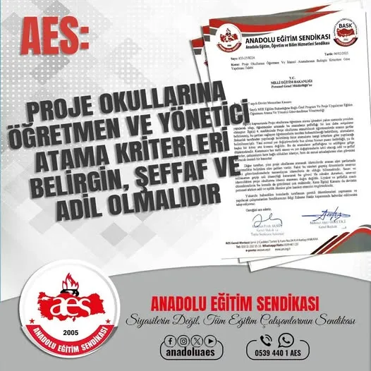 Anadolu Eğitim Sendikası (AES), proje okullarına öğretmen ve yönetici atamalarında şeffaf ve adil bir sistem oluşturulması gerektiğini vurgulayan bir yazılı basın açıklaması yaptı. Açıklamada, öğretmenlerin bu okullara atanma süreciyle ilgili ciddi kaygılar taşıdığına dikkat çekildi.