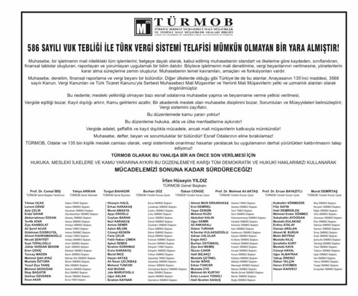 Türkiye Serbest Muhasebeci Mali Müşavirler ve Yeminli Mali Müşavirler Odaları Birliği (TÜRMOB), 586 Sayılı Vergi Usul Kanunu (VUK) Genel Tebliği ile getirilen yeni düzenlemeye karşı yazılı bir açıklama yaptı. Açıklamada, mesleki yeterliliği bulunmayan esnaf odalarına muhasebe yapma ve beyanname verme yetkisi tanınmasının, Türk vergi sistemi açısından telafisi mümkün olmayan sonuçlar doğurabileceği belirtildi.