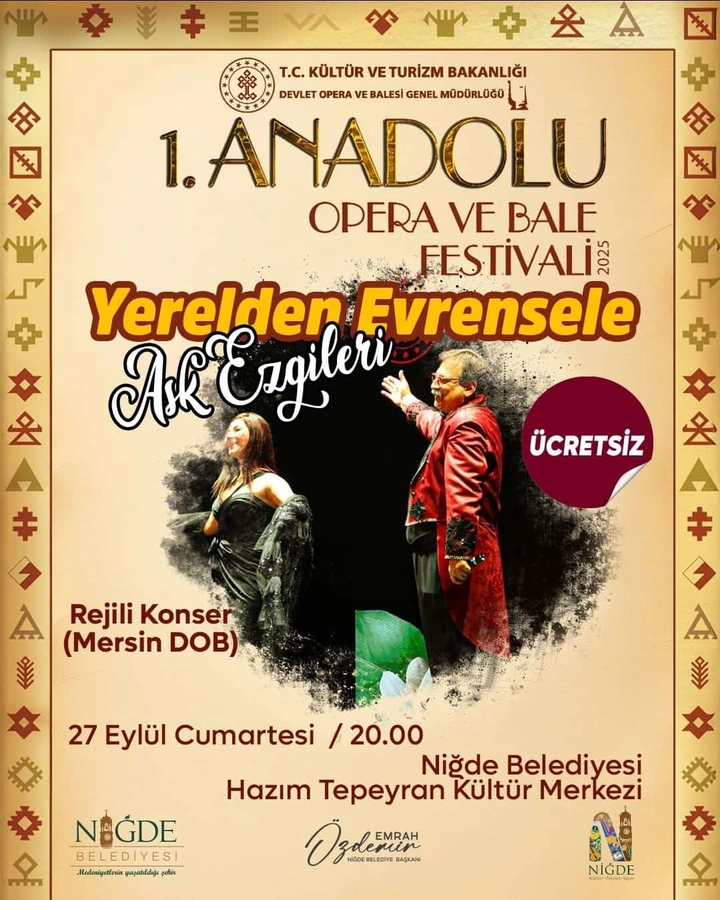 T.C. Kültür ve Turizm Bakanlığı Devlet Opera ve Balesi Genel Müdürlüğü tarafından düzenlenen 1. Anadolu Opera ve Bale Festivali, Niğde’de sanatseverlerle buluşuyor. Festival kapsamında “Yerelden Evrensele Aşk Ezgileri” adlı rejili konser, 27 Eylül Cumartesi günü saat 20.00’de Hazım Tepeyurt Kültür Merkezi’nde sahnelenecek. Mersin Devlet Opera ve Balesi sanatçılarının sahne alacağı etkinlik, müzikseverlere unutulmaz bir gece yaşatacak.