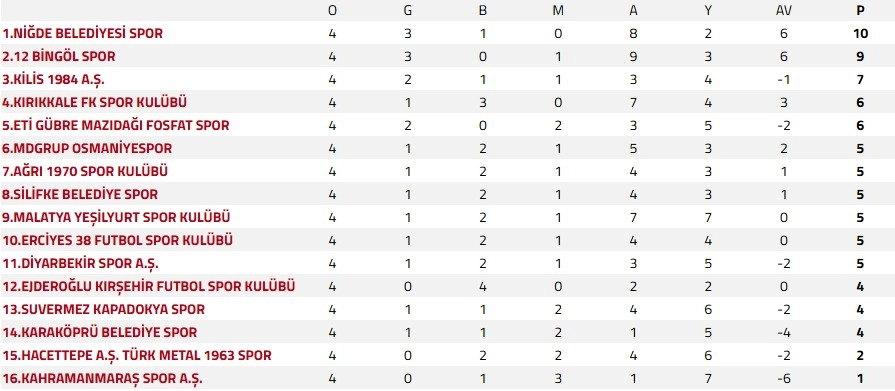 Sezona fırtına gibi başlayan Niğde ekibi, geride kalan 4 haftada rakip filelere 8 gol gönderirken kalesinde yalnızca 2 gol gördü. Hücum gücü ve savunma direnciyle dikkat çeken kırmızı-beyazlılar, namağlup unvanını koruyarak zirvedeki yerini sağlamlaştırmak istiyor.