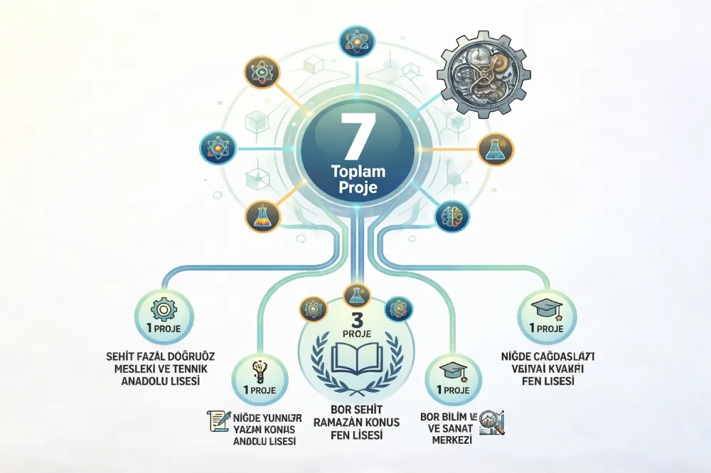 Niğde İl Millî Eğitim Müdürlüğü koordinesinde yürütülen çalışmalar sonucunda, Niğde’den toplam yedi proje bölge finallerine kalmaya hak kazandı. Başarılı projelerin, farklı okullardan öğrenciler ve danışman öğretmenler tarafından hazırlandığı belirtildi.