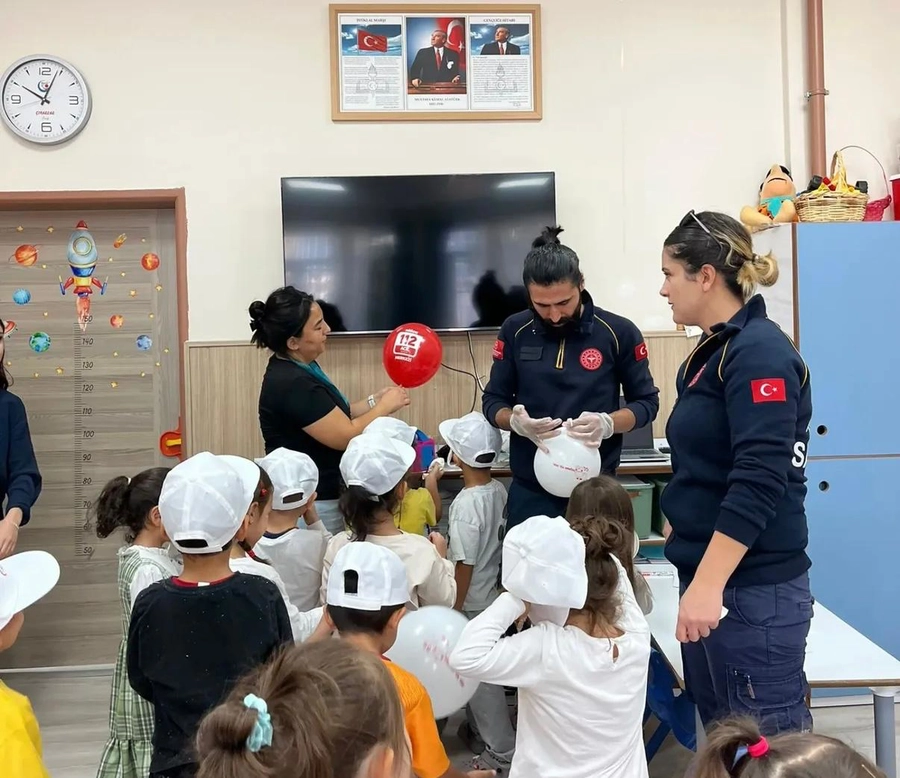 Öğrencilere 112 Acil Çağrı Hattı’nın gereksiz yere aranmasının önlenmesi, trafikte ambulansların geçiş önceliğine dikkat edilmesi gibi konularda bilgilendirme yapıldı.