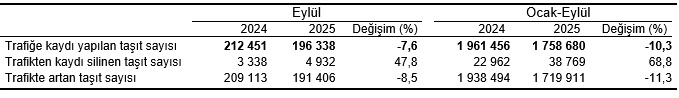 Trafiğe kaydı yapılan ve trafikten kaydı silinen motorlu kara taşıtları, Eylül 2025