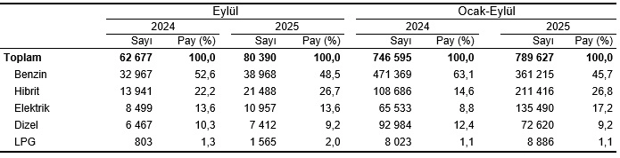 Ocak-Eylül döneminde trafiğe kaydı yapılan 789 bin 627 adet otomobilin %45,7'si benzin, %26,8'i hibrit, %17,2'si elektrikli, %9,2'si dizel ve %1,1'i LPG yakıtlıdır. Eylül ayı sonu itibarıyla trafiğe kayıtlı 17 milyon 27 bin 89 adet otomobilin ise %33,0'ı dizel, %30,7'si benzin, %30,6'sı LPG, %3,5'i hibrit ve %1,9'u elektriklidir. Yakıt türü bilinmeyen(3) otomobillerin oranı ise %0,2'dir.