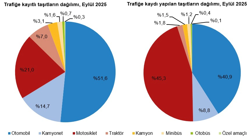 Eylül ayında trafiğe kaydı yapılan taşıtların %45,3'ünü motosiklet, %40,9'unu otomobil, %8,8'ini kamyonet, %1,8'ini traktör, %1,5'ini kamyon, %1,2'sini minibüs, %0,4'ünü otobüs ve %0,1'ini özel amaçlı taşıtlar oluşturdu.