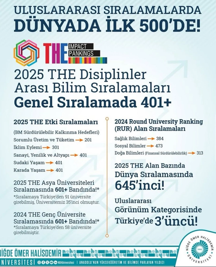 2025 THE Disiplinler Arası Bilim Sıralamaları’nda genel sıralamada 401+ bandında yer alan NÖHÜ, ayrıca THE Etki Sıralamaları kapsamında “Sorumlu Üretim ve Tüketim” kategorisinde 201’inci, “İklim Eylemi” kategorisinde 301’inci, “Sanayi, Yenilik ve Altyapı”, “Sudaki Yaşam” ve “Karada Yaşam” kategorilerinde ise 401’inci sırada yer aldı.