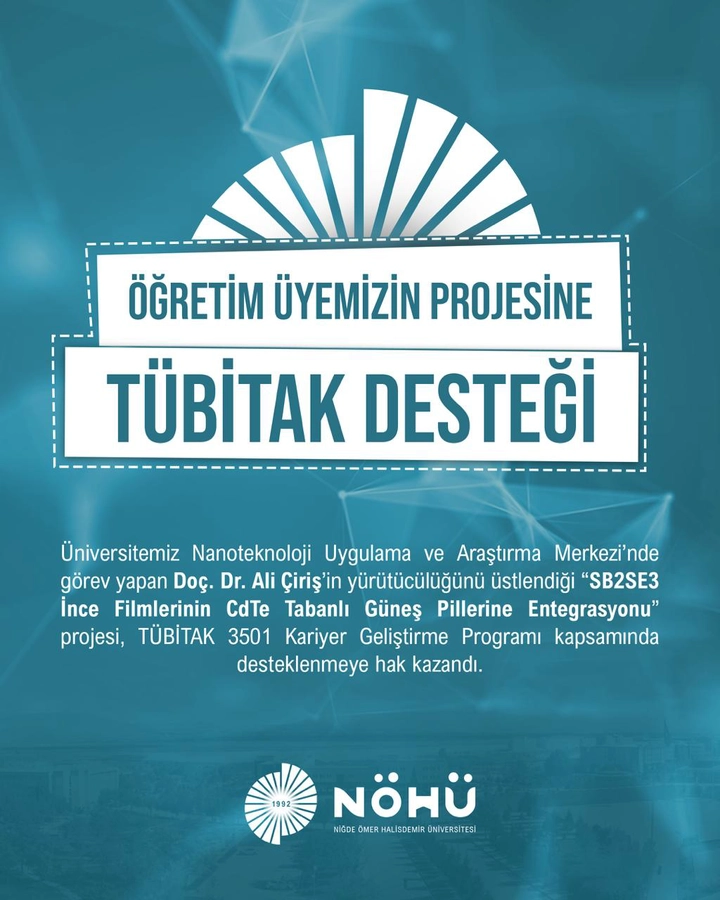 Niğde Ömer Halisdemir Üniversitesi Nanoteknoloji Uygulama ve Araştırma Merkezi’nde görev yapan Doç. Dr. Ali Çiriş’in yürütücülüğünü üstlendiği “SB2SE3 İnce Filmlerinin CdTe Tabanlı Güneş Pillerine Entegrasyonu” başlıklı proje, TÜBİTAK 3501 Kariyer Geliştirme Programı kapsamında desteklenen projeler arasında yer aldı.