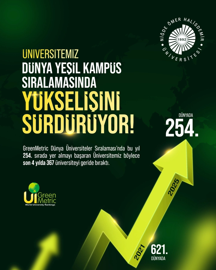 Universitas Indonesia tarafından hazırlanan ve üniversitelerin çevre, sürdürülebilirlik, enerji yönetimi, atık geri dönüşümü ve iklim dostu uygulamalarını değerlendiren “GreenMetric Dünya Üniversiteler Sıralaması”nın 2025 yılı sonuçları açıklandı. Buna göre Niğde Ömer Halisdemir Üniversitesi, 105 ülkeden dereceye giren 1.745 üniversite arasında 254’üncü sıraya yükselerek önemli bir başarıya daha imza attı.