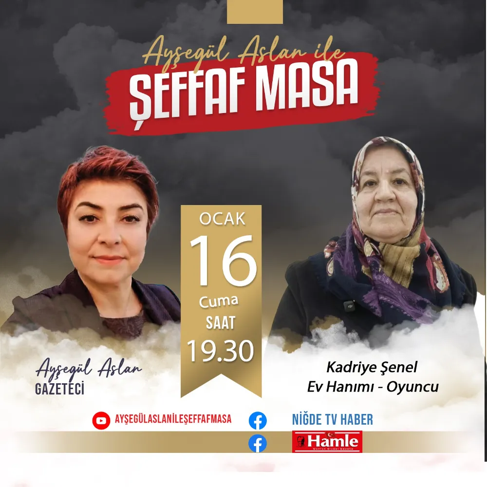İşte Kadriye Şenel ’de sahneyle değişen hayatını, kadın olmayı, cesareti, geç kalınmamış hayalleri ve tiyatronun iyileştirici gücünü deneyimli gazeteci-program yapımcısı Ayşegül Aslan’ın hazırlayıp sunduğu “Şeffaf Masa”da anlatıyor. Program 16 Ocak Cuma 19.30’da Niğde TV - Hamle Gazetesi Facebook ve Ayşegül Aslan ile Şeffaf Masa YouTube kanalında sizlerle.