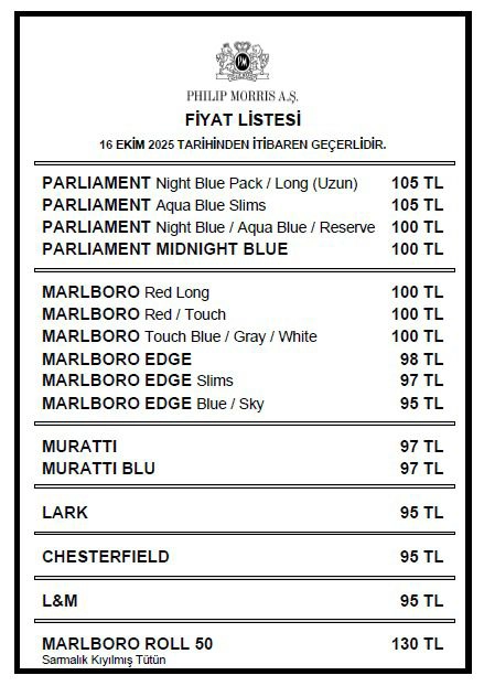 Philip Morris A.Ş., 16 Ekim 2025 tarihinden itibaren geçerli olacak yeni sigara fiyat listesini açıkladı. Yeni listeye göre birçok markada fiyat artışı yaşanırken, en yüksek fiyatlı ürün 130 TL ile “Marlboro Roll 50” oldu.
