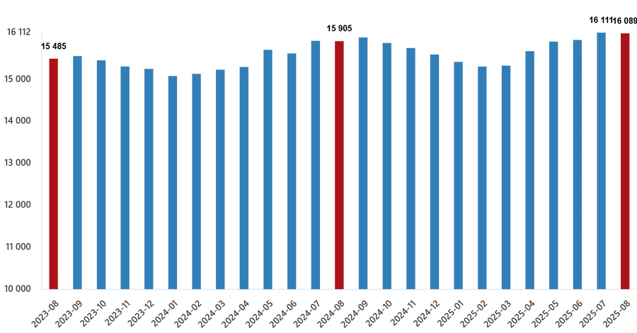 Ücretli çalışan sayısı bir önceki yılın aynı ayında 15 milyon 904 bin 602 kişi iken, 2025 yılı Ağustos ayında 16 milyon 89 bin 450 kişi oldu.